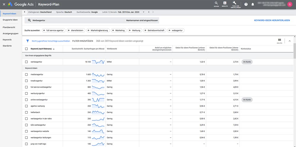 Im Anschluss nimmt man sich die restlichen Keywords und füttert den Google Keyword Planner damit. Um dieses Tool nutzen zu können müssen Sie zunächst ein Google Ads Konto anlegen. Im Keyword Planner selbst sollte man seine Liste hochladen und das Suchvolumen, sowie die zugehörigen Prognosen abrufen. Damit ist es möglich schnell und einfach die Priorität der Keywords festzulegen.