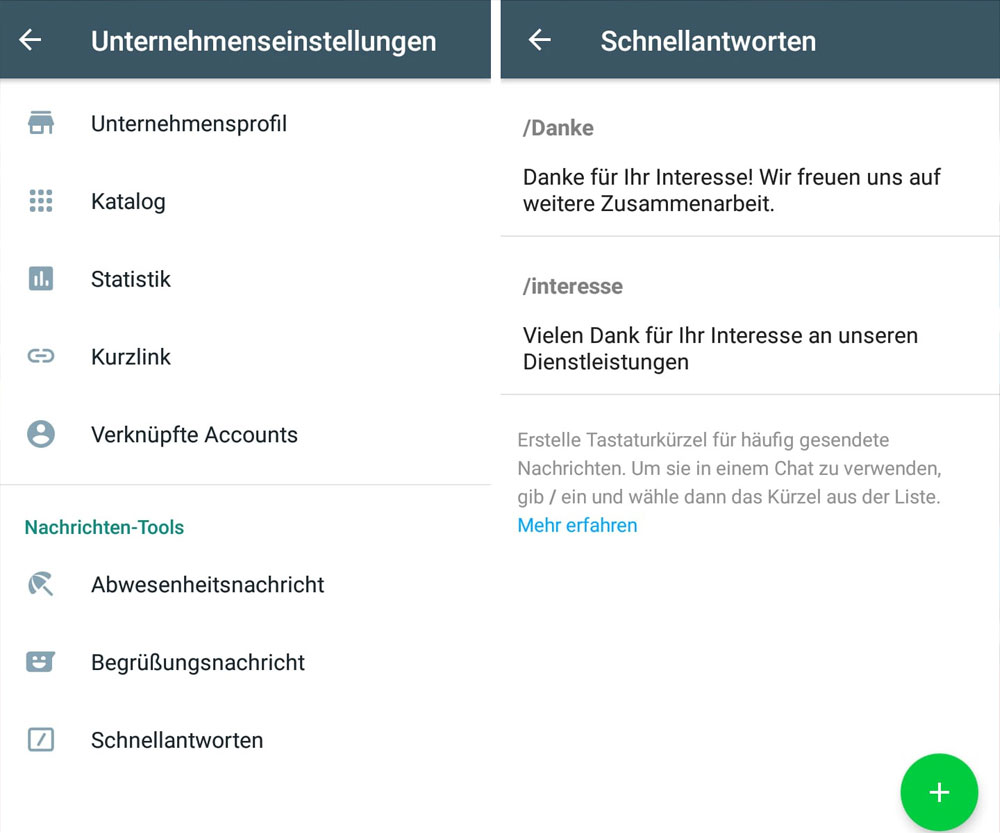 Automatische Nachrichten lassen sich nutzen, um Ihren Kunden eine automatisierte Willkommensnachricht, aber auch Abwesenheitsnachrichten zu senden. Hierbei wird die Begrüßungsnachricht beim ersten Kontakt mit Ihnen versendet. Für die Abwesenheitsnachricht lässt sich in der App ein Zeitplan erstellen, in dem die Nachricht versendet werden soll. Dies ist außerhalb der Öffnungszeiten sinnvoll, da eine automatisierte Nachricht besser ist, als keine Nachricht.